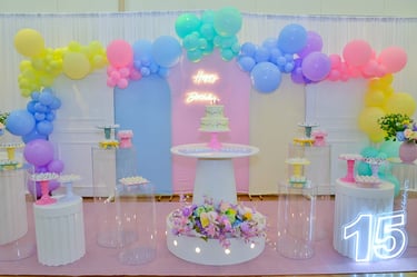A decoração da festa foi cuidadosamente pensada para criar um ambiente mágico. Com cores que harmonizavam entre si e detalhes que refletiam a personalidade da Yasmim, o espaço estava verdadeiramente deslumbrante. Um buffet variado foi oferecido aos convidados, transformando a refeição em uma experiência gastronômica. Os pratos eram de dar água na boca e complementaram a atmosfera festiva, garantindo que todos se sentissem bem-vindos e satisfeitos.